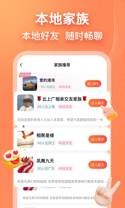 这款软件立足于本地交友,适合同城老乡找对象、交朋友。有特色的本地聊天圈子群,各位用户可以加入不同地区的本土人聊天室,用文字或者打语音、看视频的方式,结交附近的老乡,让线下见面更高效率。