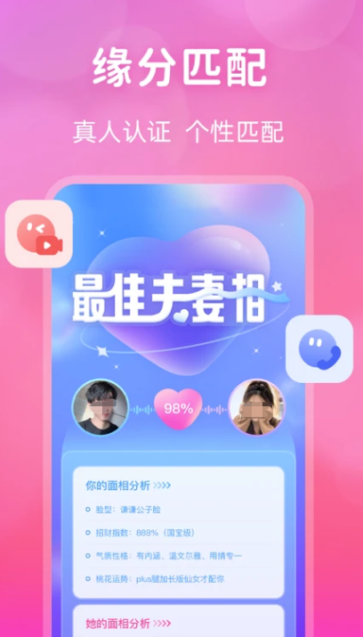 这款交友软件有真人认证与个性匹配的特色玩法,只需要输入生辰八字与上传自己的照片,可以体验软件提供的最佳夫妻相匹配,分析脸相八字等心动信号,多角度进一步了解对方,快速拉近彼此的距离。