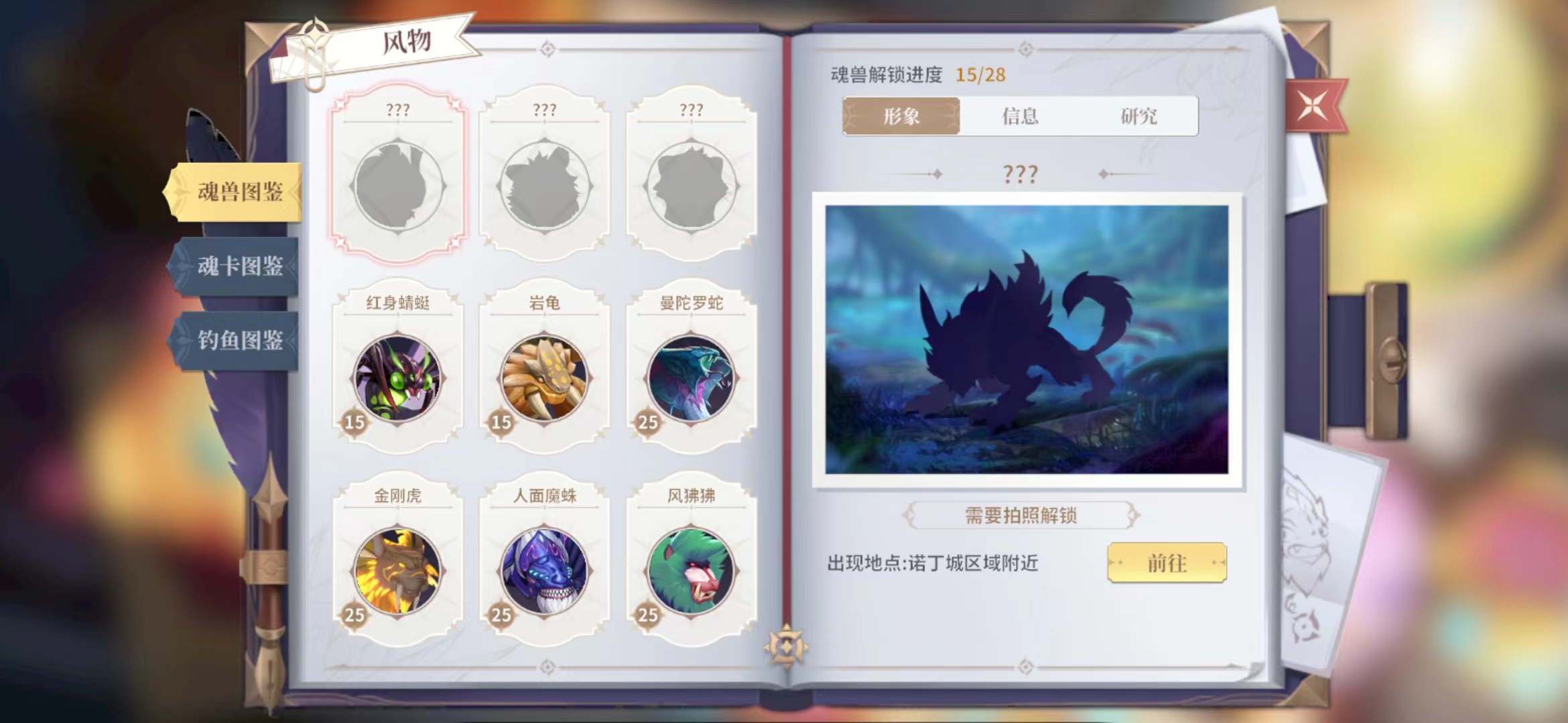 风物里面的图鉴都是大家遇到的新魂兽,每次遇到一个新的魂兽都可以点亮一个,还没有被点亮的魂兽大家也可以通过指定的地图去寻找,而魂卡图鉴则是需要大家去召唤魂卡,每一次拿到一个新的魂卡大家就可以点亮一个图鉴,在解锁了生活技能钓鱼之后大家就可以在渔场进行钓鱼,每次上钩的是新鱼类那么就可以解锁该鱼的图鉴。