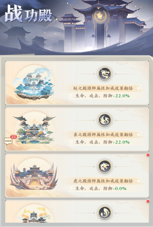 小编要推荐助战中的【战功殿】玩法,这个玩家必须要玩家们花费太多材料就可以在前期获得小额属性加成,战功殿中一共可以选择六个神殿进行派遣源师,前期可以增加源师的生命值,攻击以及防御,玩家们可以在这六个殿中进行派遣三个源师,除此之外不用在花费任何材料;