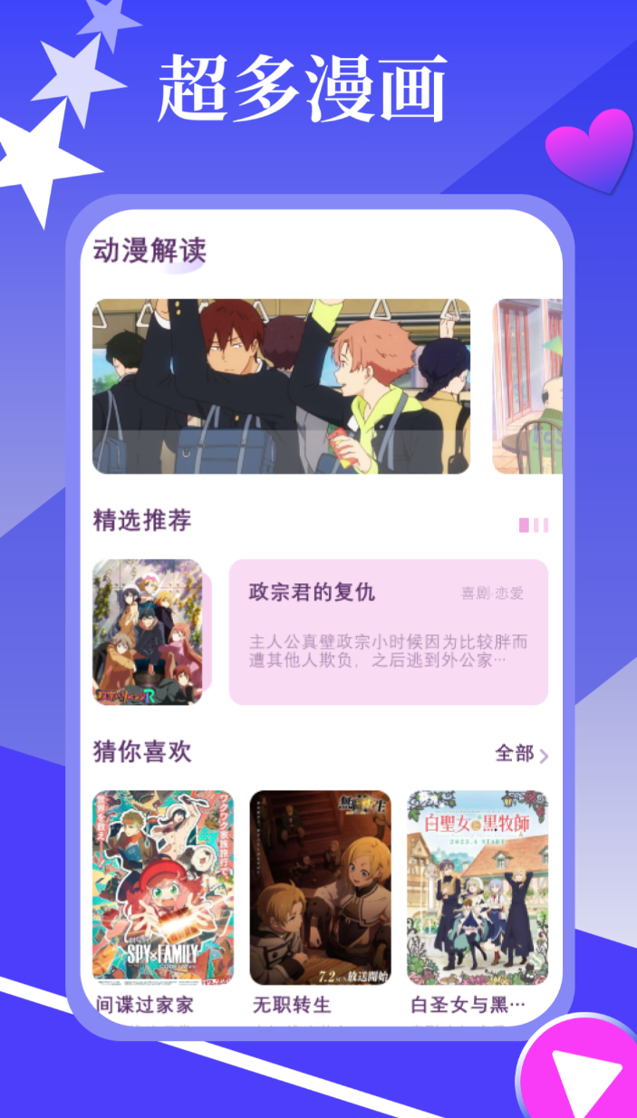 这款漫画软件是目前市场上全面、便捷的动漫资讯和观看软件之一。软件拥有庞大的动漫视频库,提供了近万部动漫影片供用户浏览观看,从老经典到新上映的都有。并且软件还有一个独特的推荐系统,能够根据用户的爱好推荐个性化的动漫影片,帮助用户快速找到自己喜欢的内容,丰富用户的娱乐生活。软件还提供了强大的下载功能,用户可以随时随地下载自己喜欢的动漫影片,离线观看更方便。