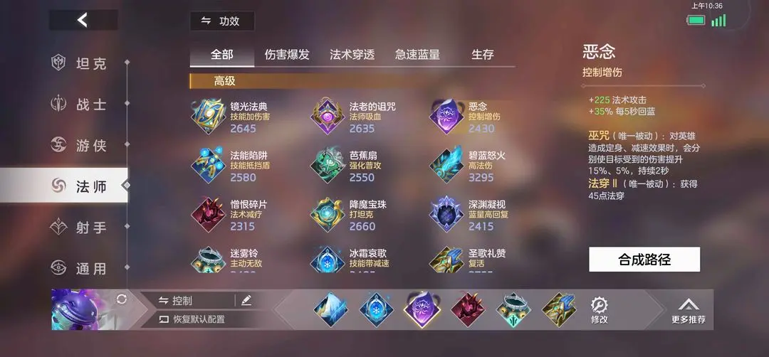 这套装备的核心搭配就是【恶念】,这个装备可以很好的强化被动伤害,而且集中了大部分远程法师所需的装备,同时镜光法典与专注之翼这两个装备可以给鳗嫚稳定的输出和法术穿透,在搭配碧蓝怒火这个装可以针对坦克做到轻松高穿透!