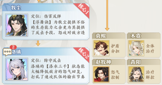 该阵容为“洛璃 牧尘 袁鲲 木霓 青阳 赵牧神”,其中洛璃与牧尘作为队内的两大头牌,前者具备伤害反弹能力,不过触发几率有限,所以需要凭借队友提供的回复或减伤手段来帮助其拥有更多机会触发,而牧尘提供的一手大幅降怒能力正好压制了敌人的进攻节奏,队伍在输出层面因而有所保障。