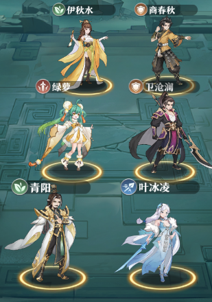 阵容的配置为“卫沧澜 商春秋 伊秋水 绿萝 青阳 叶冰凌”,这套阵容的职业丰富程度是很高的,前排两个防御职业卫沧澜和商春秋都是顶尖的肉盾,前者可以为自己加盾,后者则通过怒攻获取免伤,因此他们都可以在前线顶住很久。