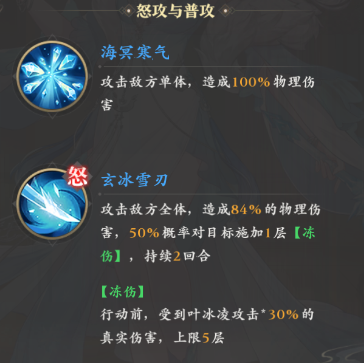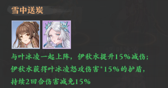 而伊秋水则可以提供回血与免伤,进一步加固包括叶冰凌等一众前排的承伤能力,而且她本身还与叶冰凌能凑成雪中送炭羁绊,两者共同上阵时,她会提升额外15%的减伤,叶冰凌的怒攻还可以为其施加相当于15%伤害的护盾。