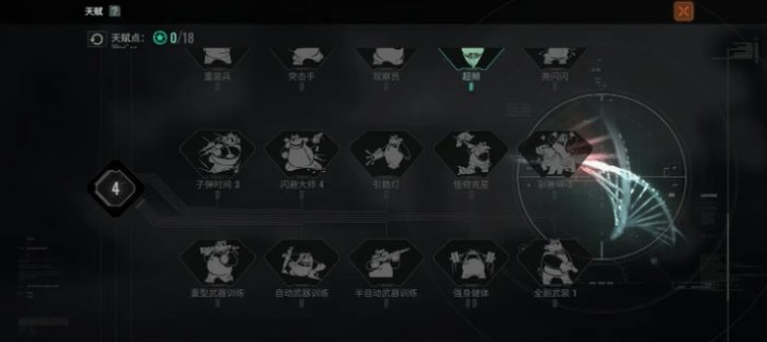 游戏中玩家可以自由分配天赋点,有重机枪专家,自动步枪专家,生存专家以及狙击专家四个方向可以发展,它分别对应力量属性,敏捷属性,体质属性和感知属性。玩家每升级一次可获取一个天赋点,可按照发展思路加点,这直接影响英雄角色的打法,是重武器输出还是轻武器突击,是吸引火力还是暗处偷袭,加点的发展方向是玩家着重需要考虑的事情。