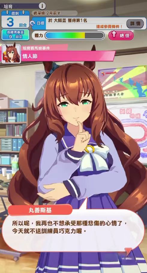 接下来为大家讲解一下她的固有技能,固有技能是当她在比赛当中进入最后的弯道时,为她增加一个速度,如果她本身就排在较前的位置,那么可以拉开和后方赛马娘的身位,值得注意的是,这时她的名字一定要在五名前,否则是很难触发固有技能的加速度时间的。