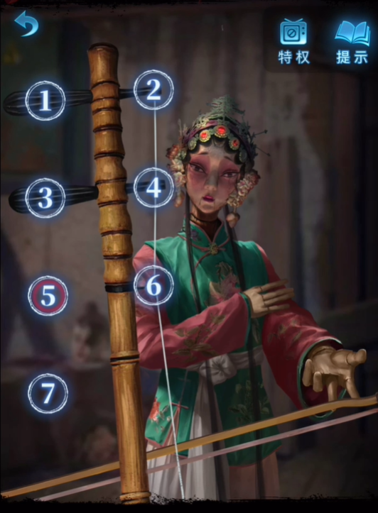 玩家在挑战完前面的关卡之后就可以来到一个有着木偶的游戏场景了,场景地上会有一个道具需要玩家拾取,然后过完剧情还会有一个道具给到大家,拿上这些道具继续回阁楼中,按照353.17.62的顺序拉动二胡,同时,小伙伴们需要记住玩偶拉动二胡的手势哦,这个在后续的解密中会起到很重要的作用。