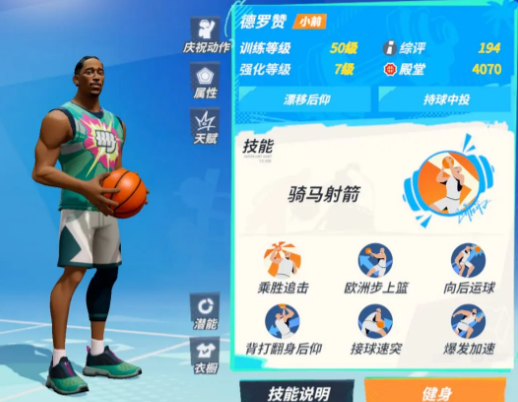在比赛的时候,德罗赞可以使用【欧洲步上篮】来轻松得分,技能开启的时候可以非常灵活的直接从侧面绕开对手来达到上篮,玩家们在上篮的时候一定要注意,自身的区域内是否有防守球员,当球员较少的时候是可以直接进行投篮的,这样概率会比较大!