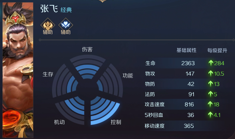 张飞:这是个很好配合队友的强力坦克,被动可以直接依据附近的敌方英雄数量来提升双抗,主动技能则可以通过向前突刺蛇矛以此造成物理伤害并将自己拉向敌人。