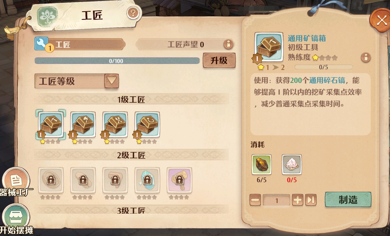 不过工匠本身也有着严格的升级体系,它需要不断解锁新配方才能制作新的工具和材料,图纸的熟练度和工匠的等级也是限制工匠制造建筑和装备的一大因素,所以每天尽量把所有锻造次数给用完,否则会影响工匠的升级效率,
