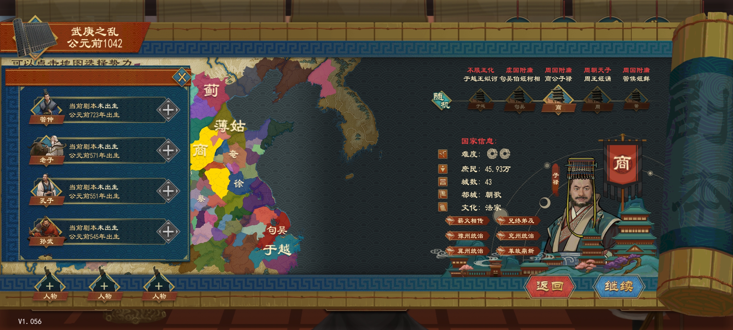 不同的剧本的年代不同,如果选择的人物在剧本出生之前,这个人物有可能无效。比如武庚之乱的剧本是公元前1042年,许行实在公元前372年出生,中间差了将近700年,需要推演到他出生的时间才会等到他来投奔玩家。