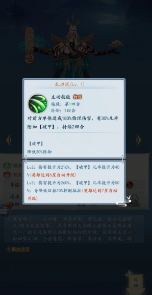 第一个主动技能是乱刃风,也是带来一个物理伤害的技能,使用的时候会对前方范围之内的敌方单体带来180%的伤害,跟技能特点一样是物理伤害,在伤害造成之后还有有30%几率可以带来破甲的状态影响对面的防御,有破甲的情况可以持续2回合的效果。