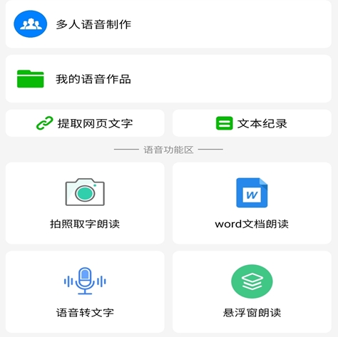 在这里用户能去进行多人的语音制作,同时也能把自己的语音作品进行本地的保存,一键就能去提取网络页面中的文字进行进行语音的朗读,还能生成文本记录给到大家。