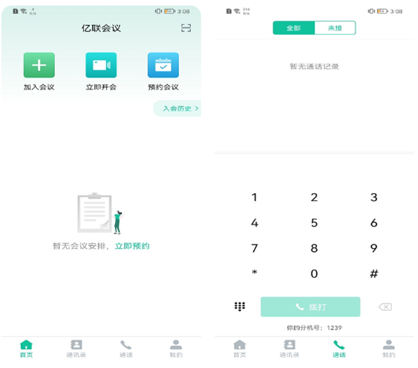 软件的操作界面比较简洁,没有什么多余的广告区域,在首页中就可以创建或者是加入会议,更是可以看到常驻会议房间的记录。软件还带有通讯录和单独通话功能,与同事和伙伴联系沟通更加方便!