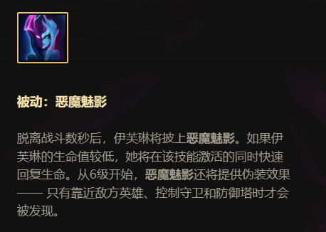 在不攻击或使用技能4秒后,伊芙琳格自身笼罩在恶魔魅影中。当低于( (250--590) ( 250%AP) )生命值时,恶魔魅影每秒恢复每秒(15--150)生命值。从6级开始,它还会提供伪装(隐身)。受到来自英雄或防御塔的伤害,会使恶魔魅影被移除1.5秒。