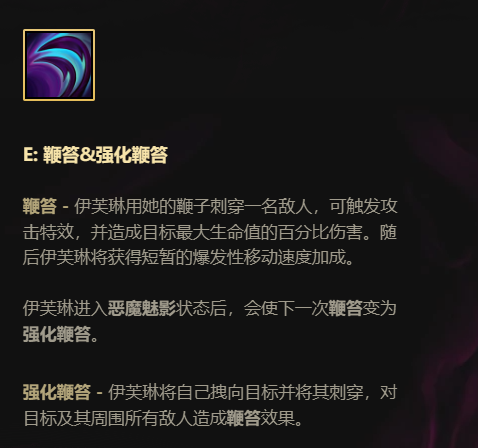 伊芙琳鞭打一名敌人,造成( (55/70/85/100/115) (0.015%AP) 最大生命值))的魔法伤害。伊芙琳获得30%移动速度,持续2秒。进入恶魔魅影 会刷新这个技能的冷却时间并使其获得强化。当这个技能获得强化后,伊芙琳会冲刺向目标并对她的目标和沿途的所有敌人造成((75/100/125/150/175) ( 0.025%)最大生命值)的魔法伤害。这个技能会对目标敌人施加攻击特效。