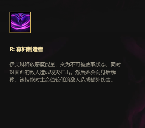 伊芙琳释放她的恶魔能量,造成大量伤害、变为不可被选取状态并向后传送。她造成(125/250/375 75%AP)魔法伤害。如果敌人低于30%生命值,则此伤害提升至(300/600/900 180%AP)魔法伤害。在施放的同时,给[恶魔魅影]设置一个为期1.25秒的冷却时间。不可被选取的单位不会受到敌人的攻击或技能的影响,除非在进入此状态前已被它们影响。