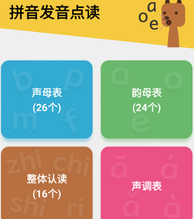 这是非常有特色的学习拼音小工具,主要针对于学龄前儿童以及正在学习汉语的人士所打造,按照字母表进行分类,有声母、韵母、整体认读音节等齐全的分类。有非常强大的声调表,学习这些拼音字母之后,还可详细了解发音。