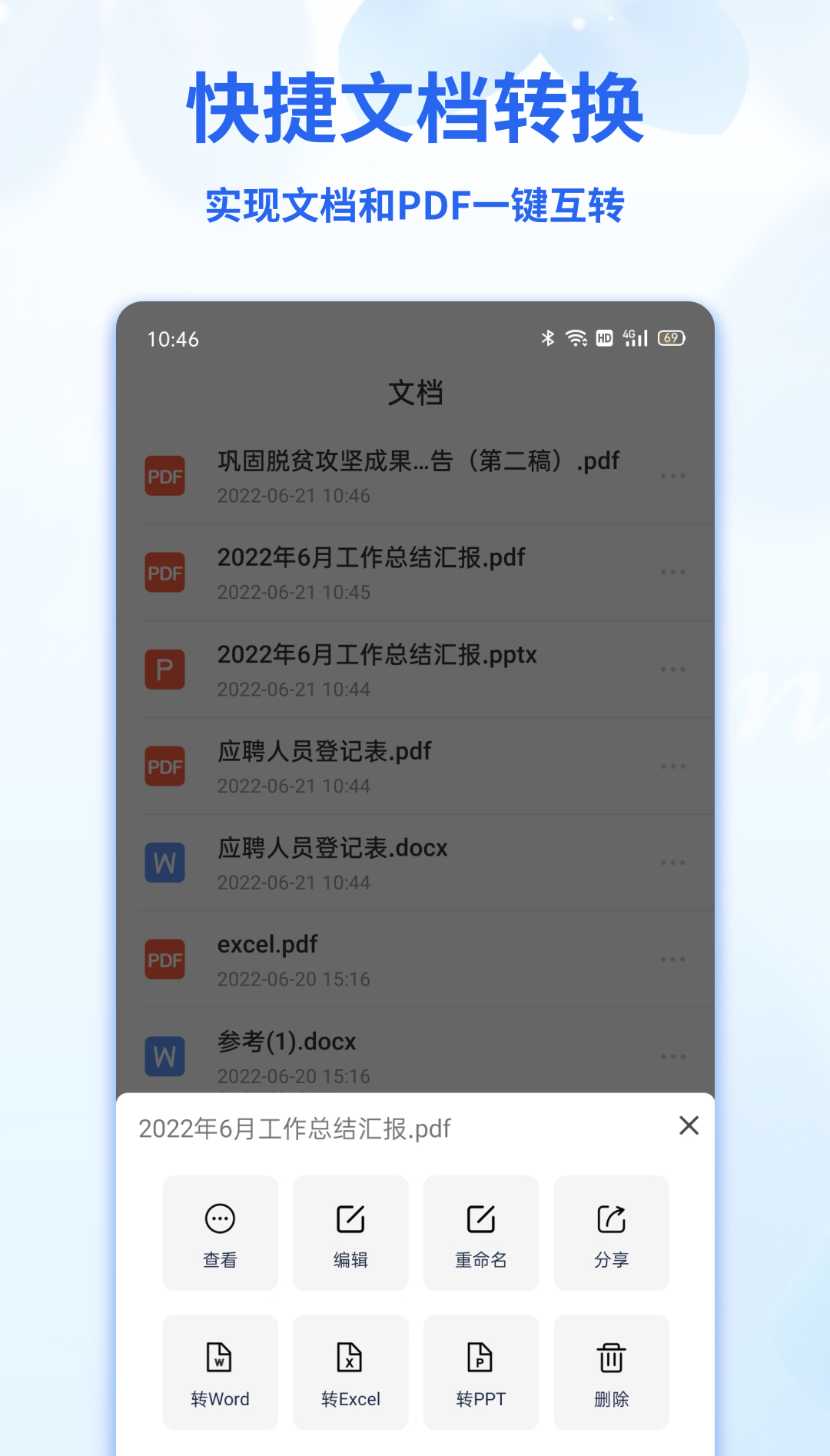 可以让大家在手机上就编辑文档了,能够满足将word转换成PPT、excel和PDF等等的格式,可以把这些格式转换成word的形式,制作好之后,分享到微信、QQ、钉钉等其他的渠道和平台。
