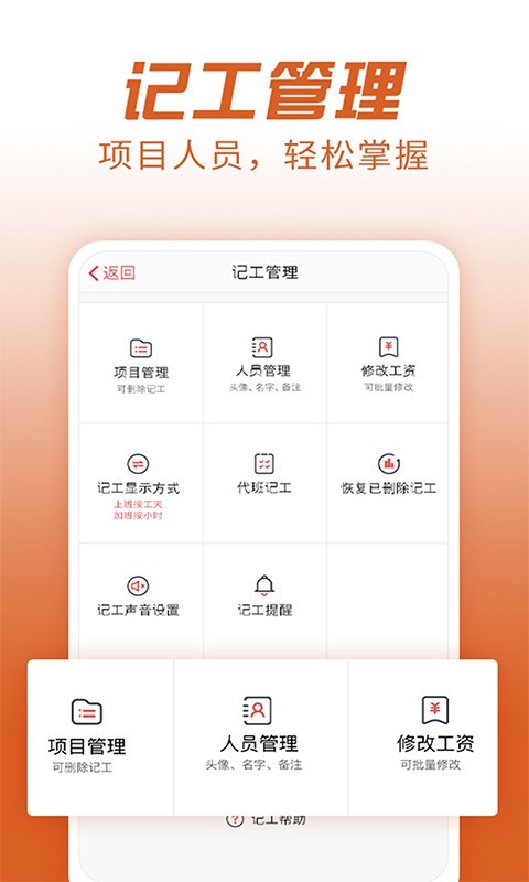 工地记加班这款软件可以将整个工作组的项目人员通过通讯录的形式快速地导入到软件中,这对于我们规范性的管理整个项目人员的调动和调配有非常重要的帮助,并且在这款软件上我们能够批量地管理每个人员的工资,可以轻松的了解每天上工的具体人数。同时在这款软件上大家还可以添加可以细致说明每天每个员工工作时长以及具体的内容的记工日志,记录过程非常的简单而且最终的查看也是十分的方便,真正实现了提高事件的处理效率。
