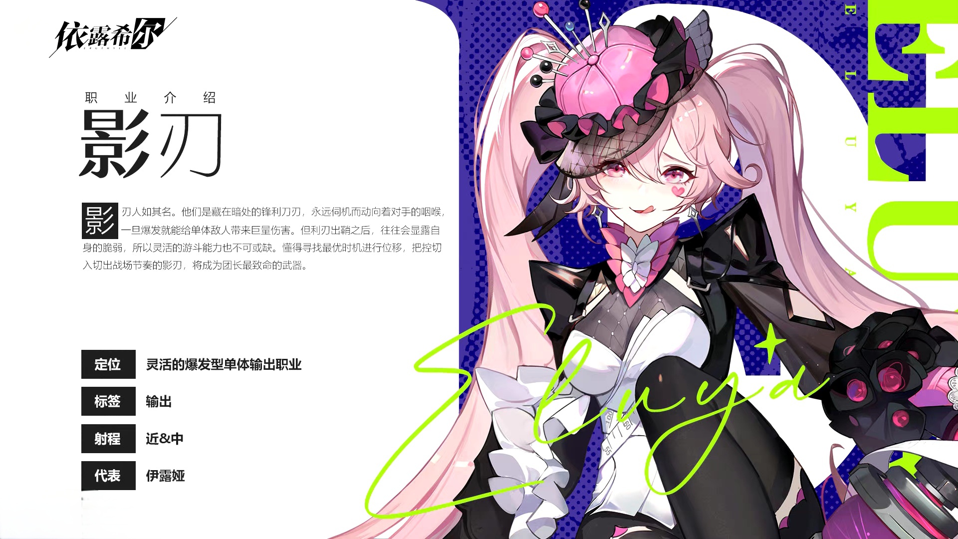 她的口头禅是[很差点就忘了我还有取人性命的天赋呢],整个人都散发着一种黑暗的危险气息,想要获取到她的途径其实是比较多的,同时她虽然是刺客当中的一员,但是要和刺客队伍当中其她的角色对比起来的话,还算是比较不强的存在,但是她的优点就是在于比其她的刺客型角色更加容易获取,这样的话新手玩家在前期没有刺客角色使用时可以使用她弥补一下刺客位置的不足。