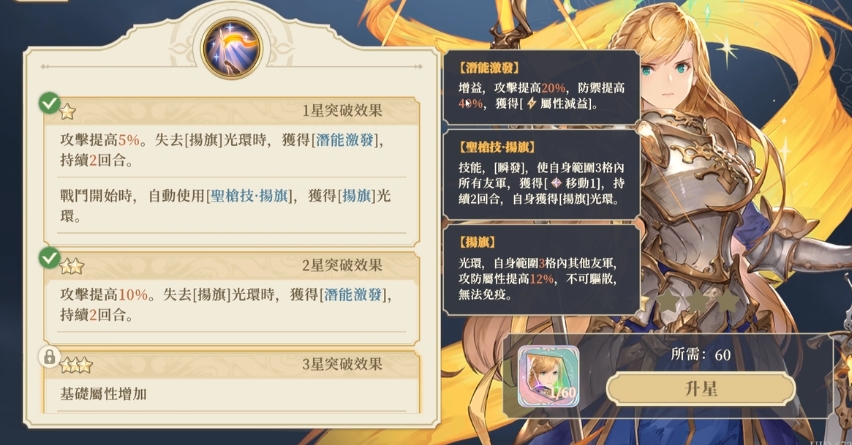 歌洛莉亚是一个四星的角色,所以在上面其实是可以先提升一段输出之后再去进行攻击的,在一开始大家就可以使用圣枪技里面的扬旗,在使用的时候不仅歌洛莉亚自己有加成,周边的队友还可以在上面增加自己的移动格子数量,这样对于避过对面防御是有加成的。