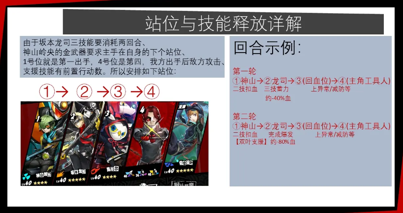 第一回合:让主角先打觉醒技能来增加全体角色的攻击和暴率,辅助角色使用适当的辅助技能来增强自身或者全体角色的防御力或者其他属性,坂本龙司使用三技能蓄力一击来跳过本回合,并且让自己进入残血状态,神山岭央使用二技增加自己和坂本龙司的输出能力和暴击倍率,并且降低敌人的防御力和暴击抵抗。