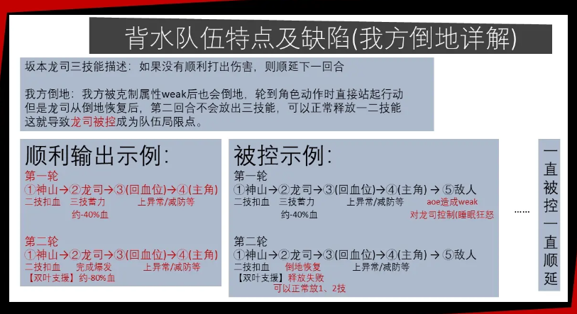 背水队的基本组成是坂本龙司、神山岭央、主角和任意一名辅助角色。主角的作用是提供多样化的属性输出和回复技能能力,以及觉醒技能来增加全体角色的攻击和暴伤。辅助角色则可以根据不同的情况来选择,比如可以选择安娜塔来提供全体回复和复活技能,或者选择高巻杏来提供全体防御力和暴击抵抗提升技能。背水队的玩法主要是通过控制坂本龙司和神山岭央的血量来达到残血状态,然后利用他们的技能来爆发出巨大伤害。