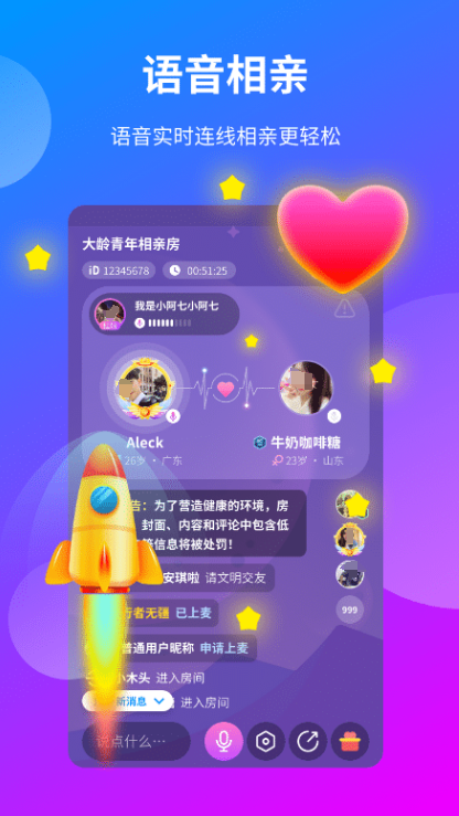 软件可以给陌生人打招呼,加好友进行视频聊天,还能送礼物互动,让感情升温。软件内有特色的语音相亲房间,实时连线让彼此之间的交流更为轻松。用全新的社交方式去发现身边的新奇世界,扩大你的社交圈子。