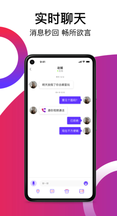这款交友软件主打视频聊天,用户可以在交友大厅上一键搜寻附近有聊天倾向的人,认识之后跟海量人畅聊。在实时聊天功能上可以一对一聊天与多人群聊,使用内置的动态功能展示魅力秀出自我,让你的交友相亲更为高效。