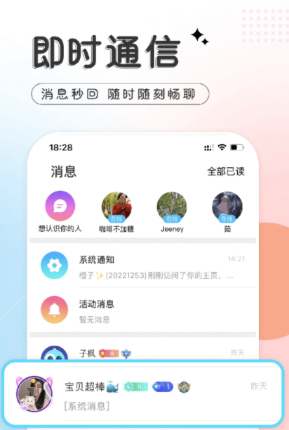 有缘分推荐功能,根据你的交友喜好倾向以及个人的信息,智能帮你匹配想要交往的异性。交友界面有图片消息与文字解读,遇到想交往的朋友,可以开启语音聊天、视频聊天功能,分享你的精彩生活动态,可让更多人了解真实的你。