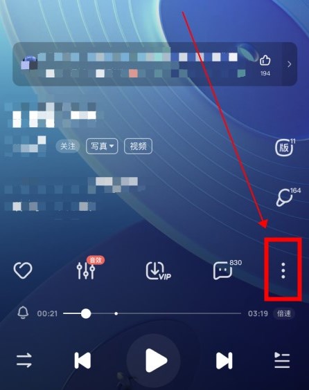 1.打开软件之后,点击播放歌曲,在歌曲的详情页中,点击下图所示右下角的三个点;