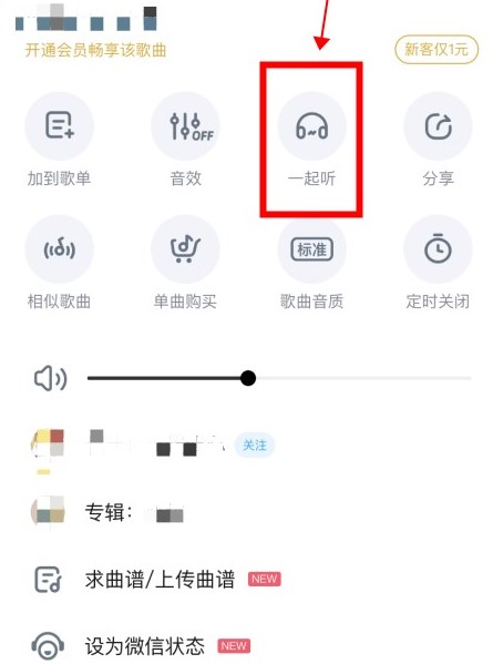 2.然后弹出一些功能选项,我们选择“一起听”功能,进入到详细设置界面;