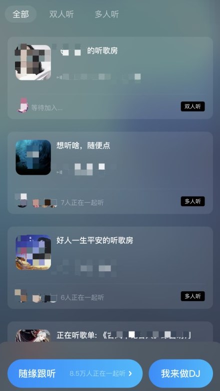 3.来到听歌房界面中之后,大家可以点击下面的“随缘跟听”,和其他用户一起听歌;