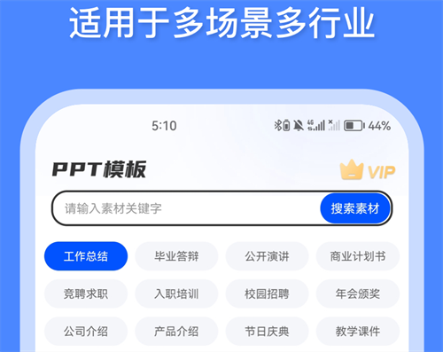 软件为大家提供了很多高质量的PPT模板,同时适应于各个不同的行业,像PPT、word等等,同时大家点击就可以保存到本地之中,不论是工作会议需要还是年度汇报等,大家都可通过它来完成。