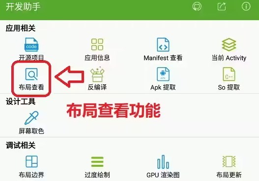2.然后启动开发助手>首页第二排>第一个功能>布局查看;