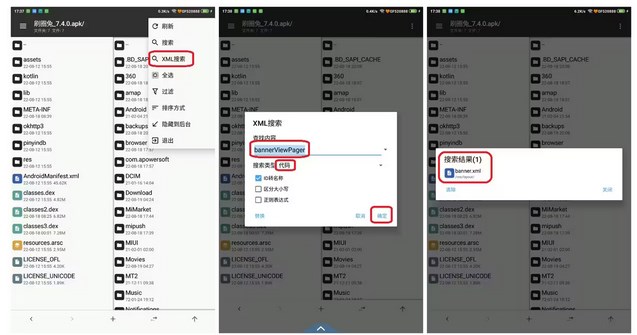5.打开MT管理器,右上角 XML搜索(类型=代码)>内容bannerViewPager>得到结果