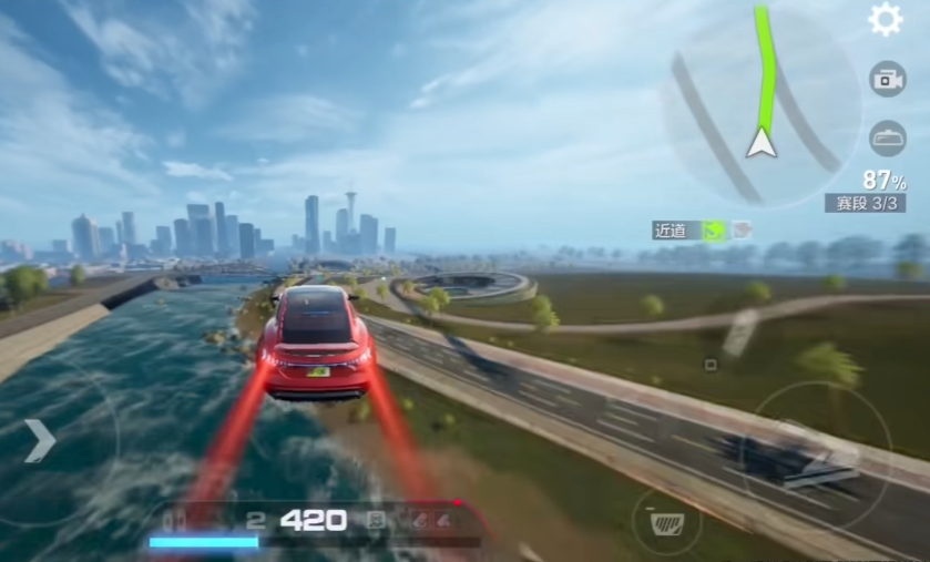 其次必须掌握漂移状态下的两种技巧。惯性漂移用于小角度过弯,按住方向键先点刹车后踩油门,达到跨度过弯目的。反向漂移用于大角度过弯,按住与漂移方相反的方向键,先点刹车后踩油门,达到调正车头的目的。另外,还有落地提速也必须掌握,当车辆腾空起落地时地面会出现打滑的情况,需要玩家在落地时油门松开,然后落地后点击油门,即可结束打滑状态并获得加速效果。