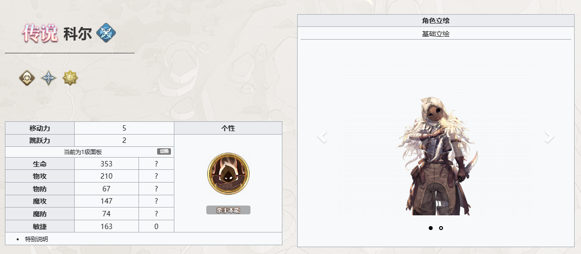 其次小编推荐的就是科尔他是一个属于瓦尔哈拉阵营的SR角色,职业是刺客。柯尔是一个非常出色的刺客型定位的角色,他可以对敌方造成致命的刺杀。他的主动技对敌方单体超高技能输出。被动技能都很出彩能够有效正价自身的爆率、爆伤,并在暴击时恢复自己一定比例的生命值。终极技可以对敌方的远程输出单位造成大量伤害,并使自己进入隐身状态,躲避所有攻击和控制效果。