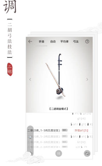 这款二胡调音APP是立足于解决中国民族乐器,二胡各种胡琴类乐器调音的一个智能调音软件。在这个二胡调音器上是根据我国乐器的真实音色采样,设计的调音平台。能够更加精准的识别调音,定弦。其中有调音模式,听音模式等多种有用的二胡调音功能。