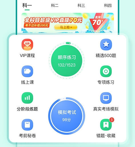 作为一款专业化的考试学习类软件,它里面提供了科目一到科目四的学习和训练,用户能根据自身的需要来合理的选择,同时还有用户学习进度的统计,让大家能实时的了解自身的学习情况,包括错题的记录与分析也会给到大家。