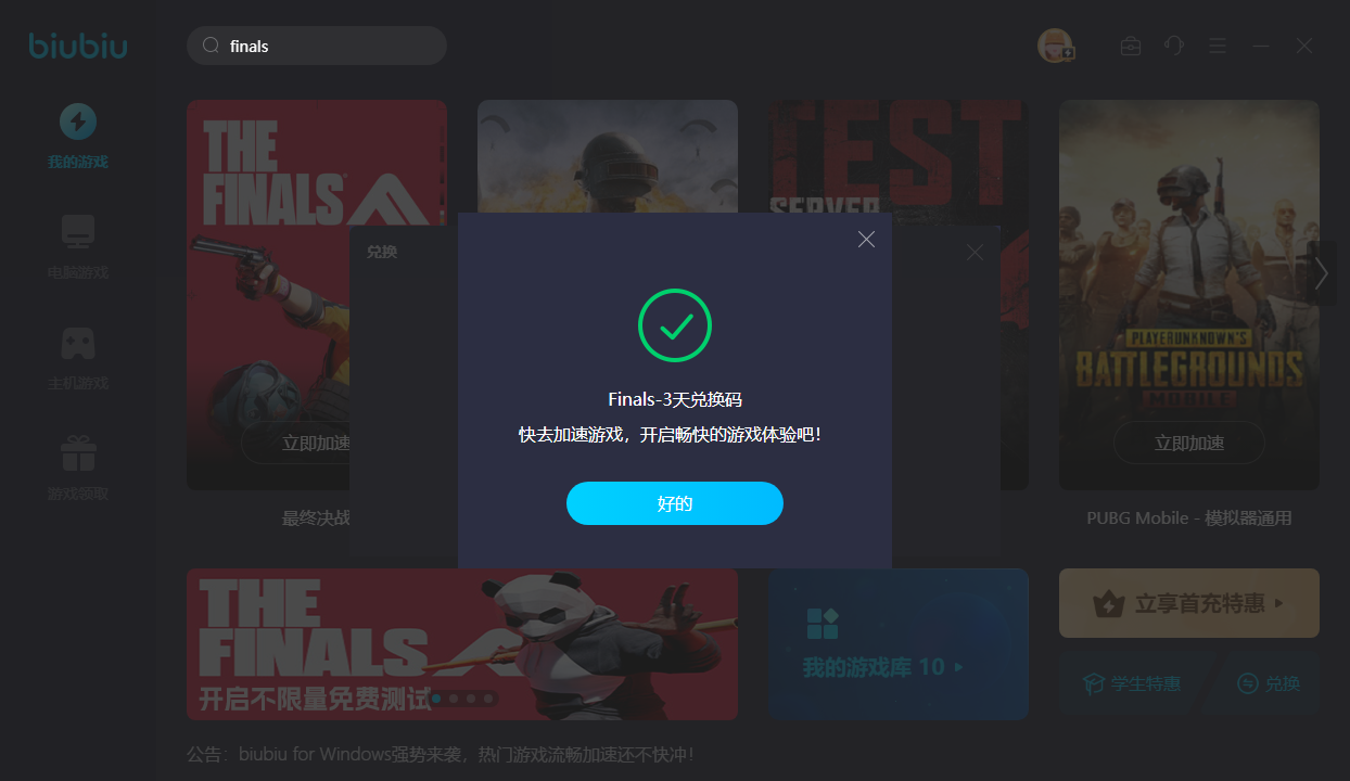 大家都知道,TheFinals在10月26日开放了新一轮的免费测试,这是本作开放的第二次测试,考虑到本次测试不但开放了跨平台联机功能,同时各个系统也已经基本完善,那么距离游戏正式上线的时间应该也不会很远,按照之前官方所说的2023年底上线,那么本作很有可能会在2023年12月份与大家正式见面。不过说到跨平台联机,相信很多小伙伴因为和其他平台的玩家使用不同的服务器,而导致联机游戏的过程中会出现卡顿、丢帧的情况,那么如果这个时候启动biubiu加速器来加速游戏,就能够让延迟降到最低,并且各位还可以在pc端的biubiu加速器点击兑换,然后输入finals,就可以得到三天的免费会员体验,让各位可以无障碍和其他服务器的玩家畅快联机。