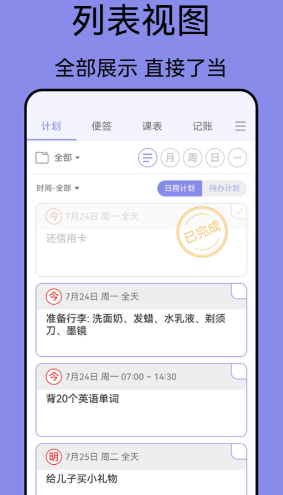 带有多种视图供大家根据需求来进行选择,更是可以在完成事项之后回到软件中进行标记,软件会自动根据完成的项目来生成报表,让我们检测到每天付出的努力和实现的进步。