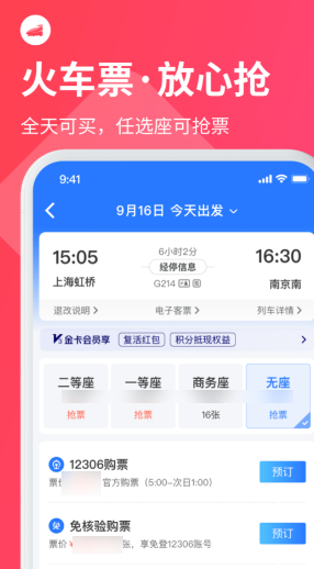 官方推出的一款火车高铁票售卖平台,可以快速查询到站点、城市之间的班次线路,而且可以即时显示出当前的余票及对应价格。积累积分还可以直接兑换车票或抵用,还是相当不错的。