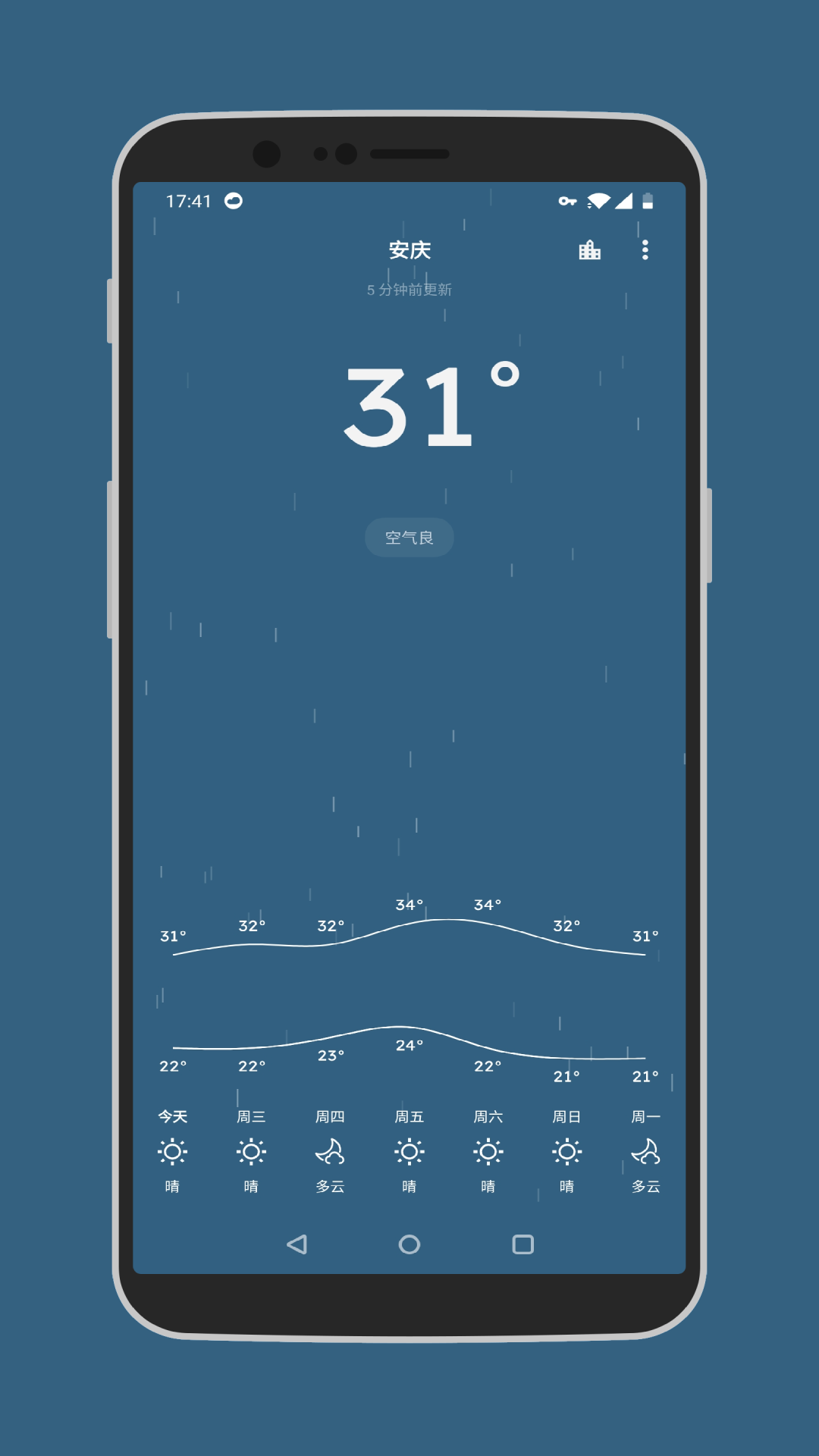这个应用给你提供了一个简单明了的天气情况界面,没有惹人烦的广告或其他事情的打扰。它的界面设计让你可以快速找到你需要的信息。