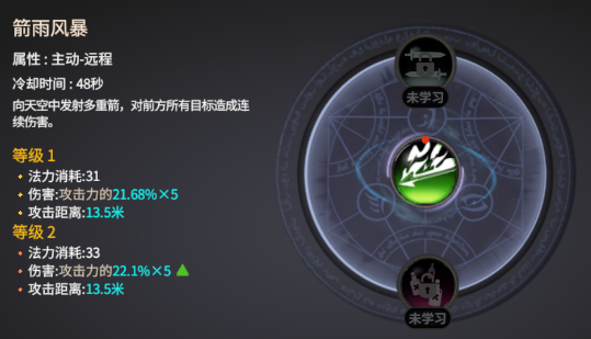 大家如果偏向打副本的话,由于副本中的boss穿透力都比较高,而弓这个武器其实没有什么位移技能,大家可以搭配【重凯】,这个技能可以短暂的提高自身的防御能力,好保证自己的存活效果!如果大家在野外的时间比较多的话,可以最后选择【箭雨风暴】,这个技能刷怪非常的快,而且是一个持续攻击伤害,释放的时候,可以向指定方向释放多个重剑,不过冷却的时间比较长!后续如果大家要使用这个技能的话,还是推荐把次技能的副天赋给学习一下!