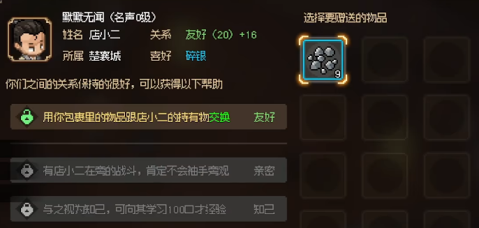 在最开始的时候,玩家一定要在游戏开始之后的次日以后,大概是在未时到亥时之间到达游戏当中的无名小村寨,在此可以触发相应的剧情,只要出发之后就会获得任务。在出现的选项当中,优先选择我替他付了这个选项,这样就可以获得许多奖励,其中包括饰品、名气等。不仅如此,玩家还会与叶银瓶的关系有所提高,最高可以达到5个点。陆续出来一些选项,玩家在选择的时候,尽量选择与叶银瓶的关系以及增加自己属性这方面。