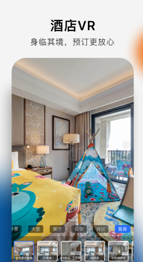 以中高档的酒店为主,可以看到房间包含的哪些服务和房间内部的一些设施情况,我们可以使用VR功能直观看到房间的一些布局和陈设,从而帮助我们进行挑选。