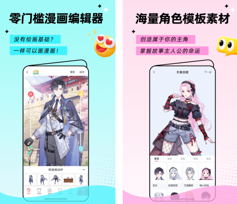 软件有漫画与漫剧两大分区,分类有古风言情、科幻悬疑、修仙修真等。有海量漫画角色、精美背景资源,零门槛编辑漫画,快来下载软件看原创漫画、亲自做漫画吧。